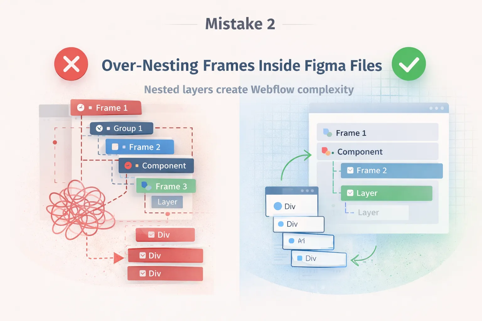 To keep designs visually organized, many designers overuse frames and groups inside figma files. While this feels tidy during design reviews, it creates unnecessary structural noise during development.