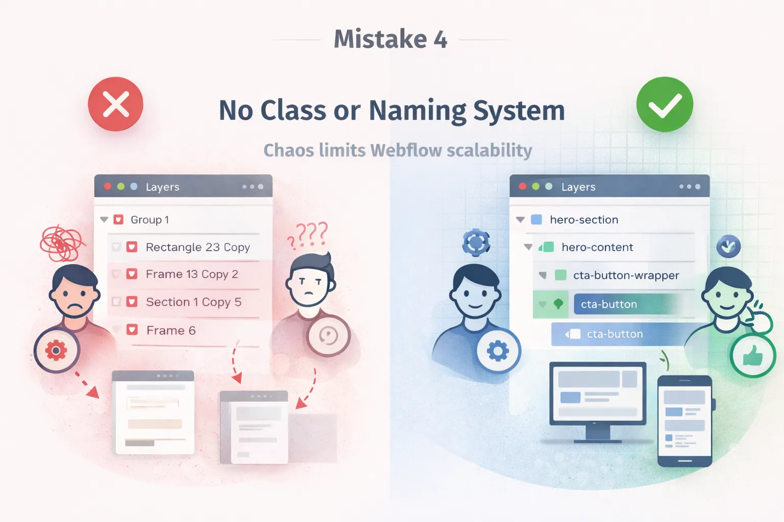 Layer names in figma design directly influence how classes are created during webflow development. When naming is random or inconsistent, the resulting Webflow class system becomes chaotic.