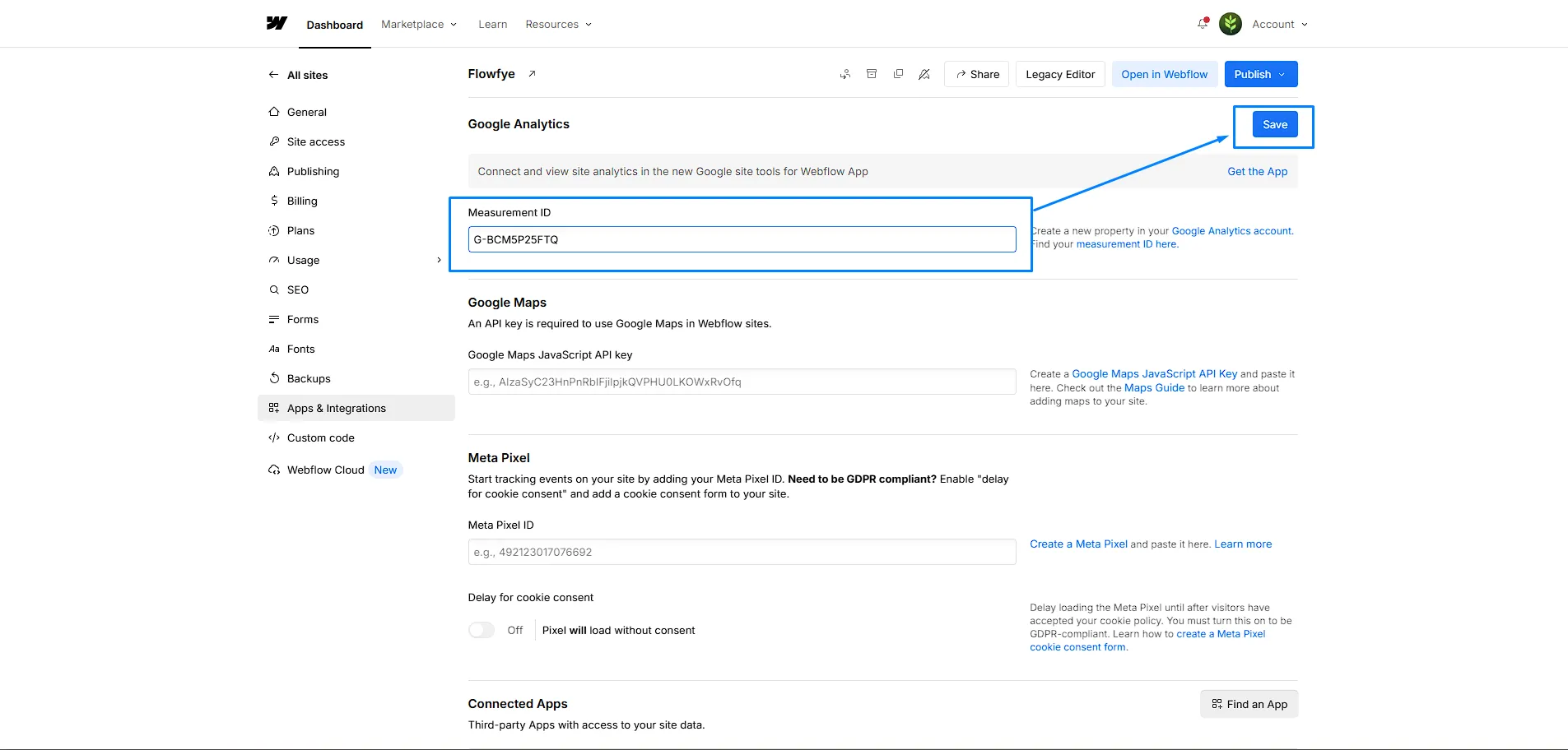 Step 3: Add Google Analytics to Webflow (Native Integration)